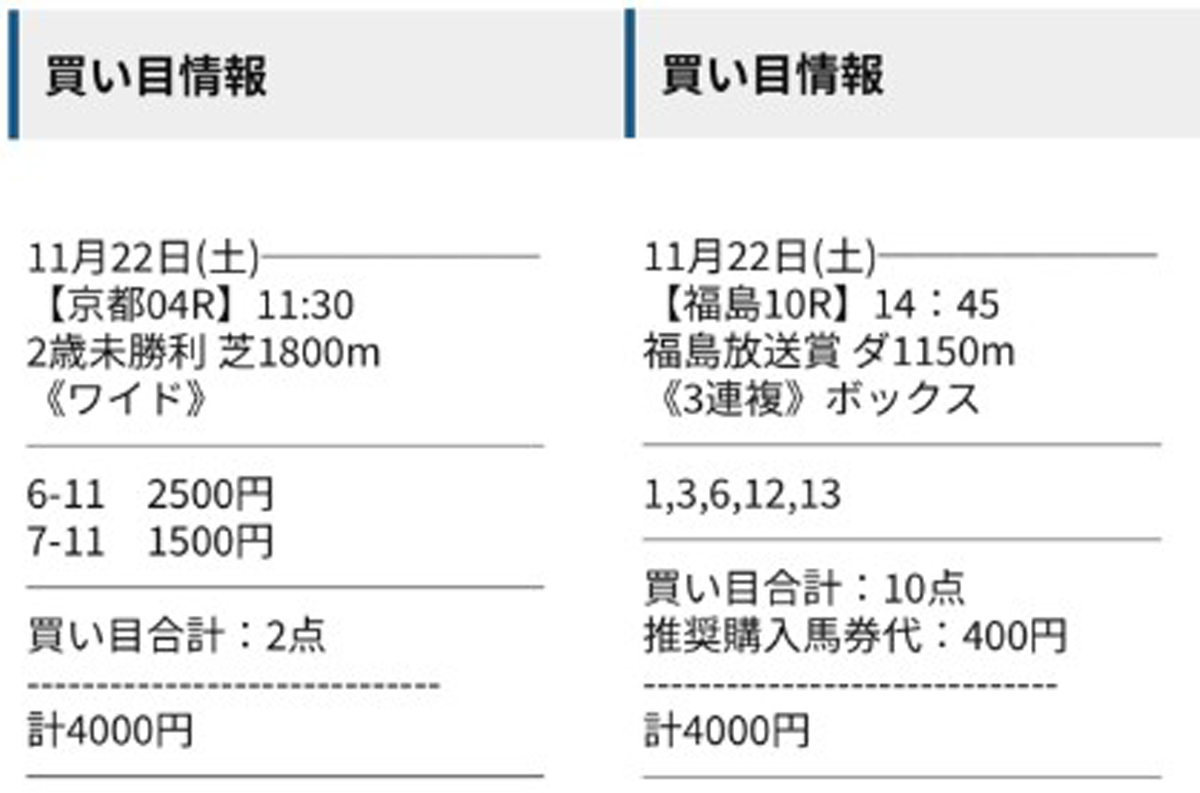 前日の福島2Rに続き、11/16福島7Rもバイアスナビを購入。ここが本当にヤバかった…。結果は13-14-15で3連単158,940円。フォーメーション9点×1点600円=5,400円の勝負で、払戻は953,640円とミリオン目前。2日連続でこのレベルの配当を引きずり出すのは、もはや“偶然”では片づけられません。トリガミ覚悟で広げるのではなく、「当てにいきながらも配当を最大化する配置」になっていて、本物のプロ集団だと感じました。